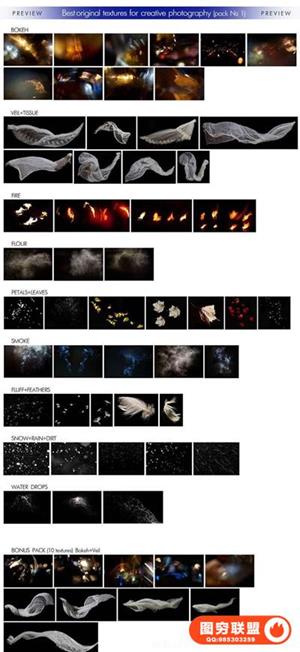 纹理:原始散景,面纱,组织,烟雾,羽毛,雪,雨,火,叶子,花瓣,绒毛,面粉,水滴。