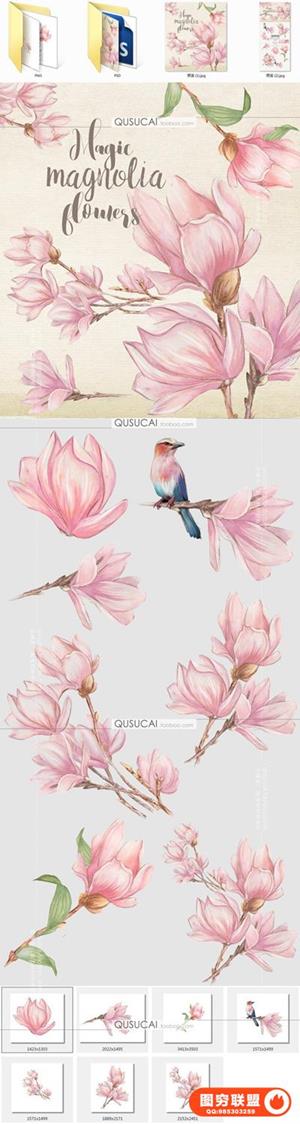图穷联盟预设 » PNG免抠浪漫手绘粉色玉兰花朵鸟水彩唯美婚庆典礼设计元素材图