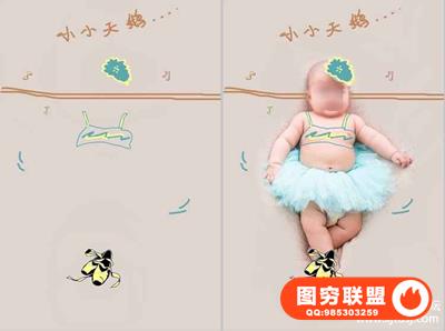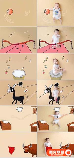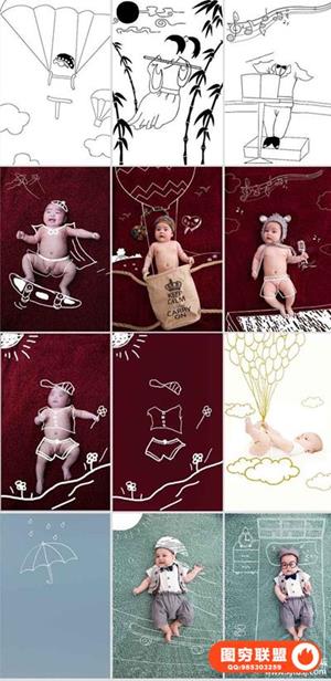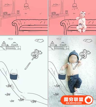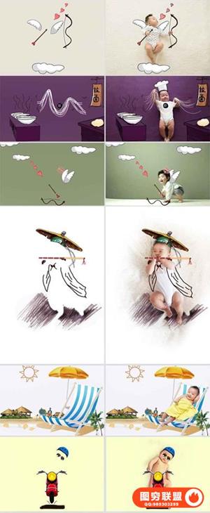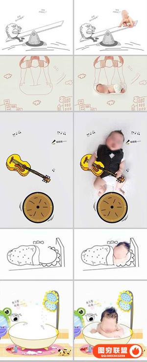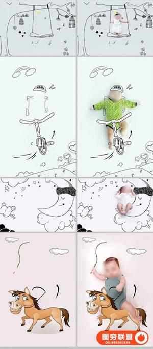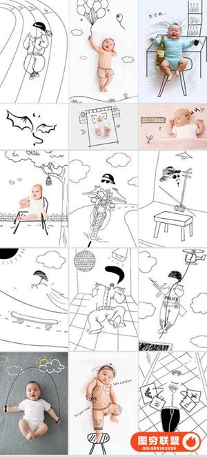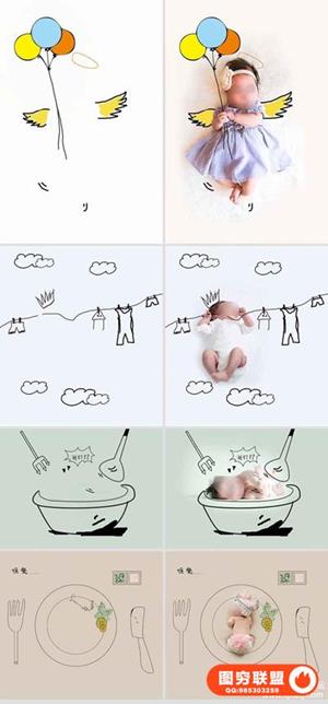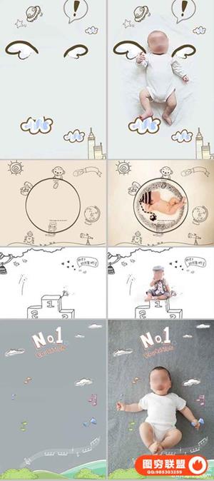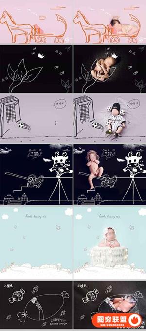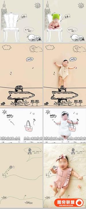 图穷联盟预设 » 影楼新创意儿童宝宝婴儿照片PSD手绘插画线条设计素材ps模板