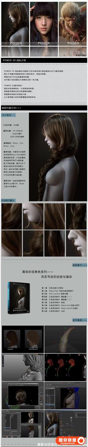 教学内容:本教学为你指导如何使用Maya Hair来制作真实感的毛发,从毛发模型的创建调节到灯光渲染都做了详细的讲解。重点分析了真实头发的形态和质感上特点,教你如何最大程度的表现头发的层次和质感,以及如何来提升真实度。